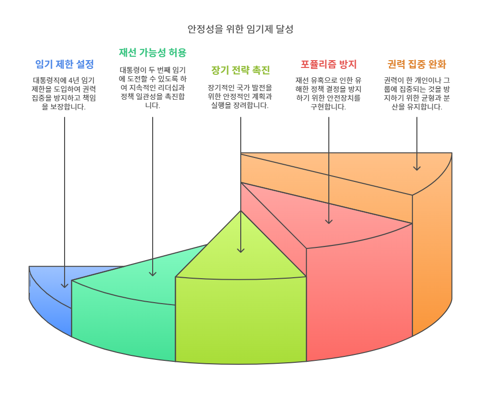 - 대통령 책임성 강화, 레임덕 현상 완화, 국민이 대통령의 성과를 평가하여 재선택 기회 부여, 장기적 국가 발전 전략 추진 가능