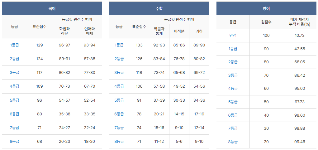 - 1등급은 원점수 100-94점, 표준점수 132점, 백분위 96에 해당하며, 8등급은 원점수 11-8점, 표준점수 69점, 백분위 4이다.