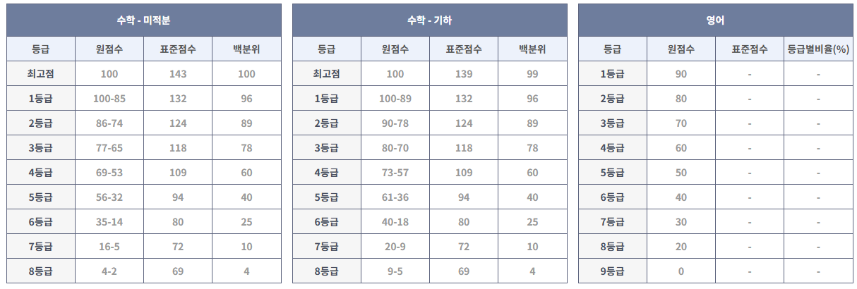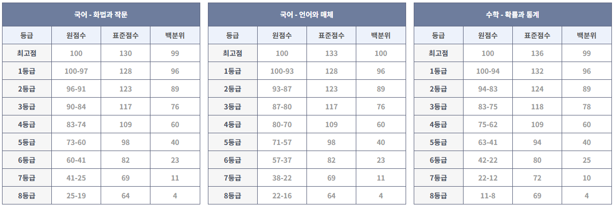 - 1등급은 원점수 100-85점, 표준점수 132점, 백분위 96에 해당하며, 8등급은 원점수 4-2점, 표준점수 69점, 백분위 4이다.